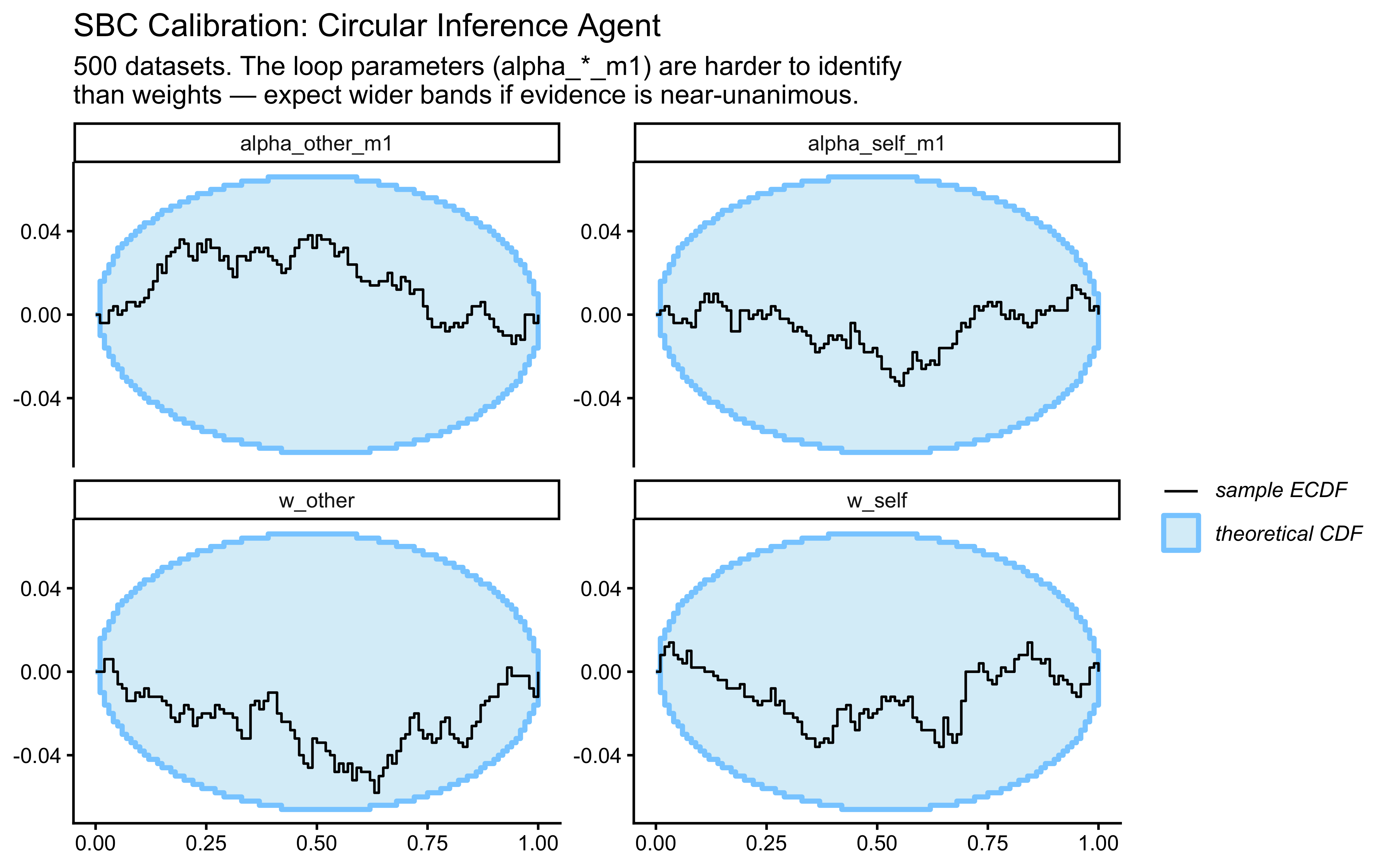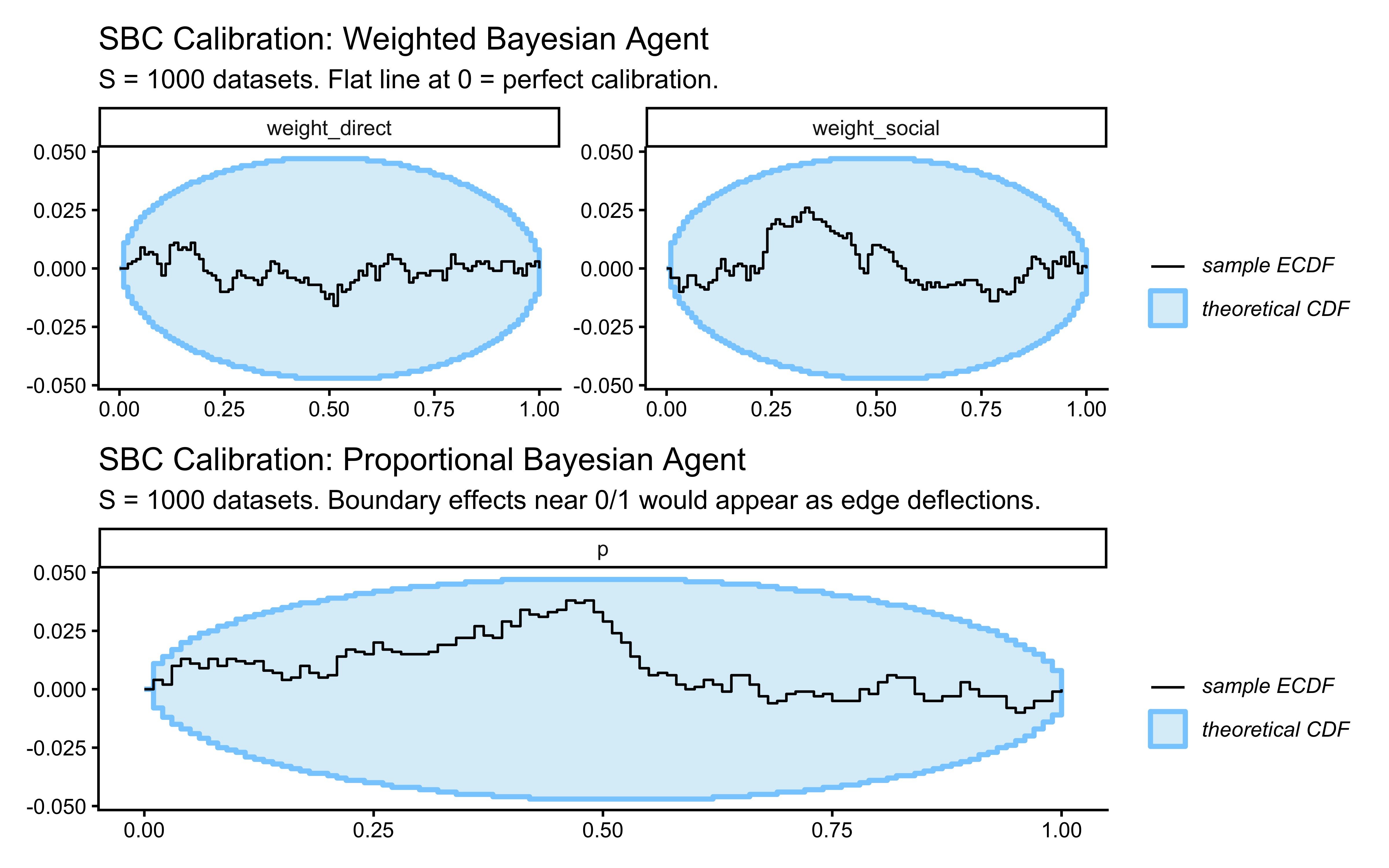 - Phase 3 — Computational Validation: Parameter recovery and Simulation-Based Calibration (SBC) certify that the Stan sampler is unbiased and can recover the true parameters from data generated by our models.