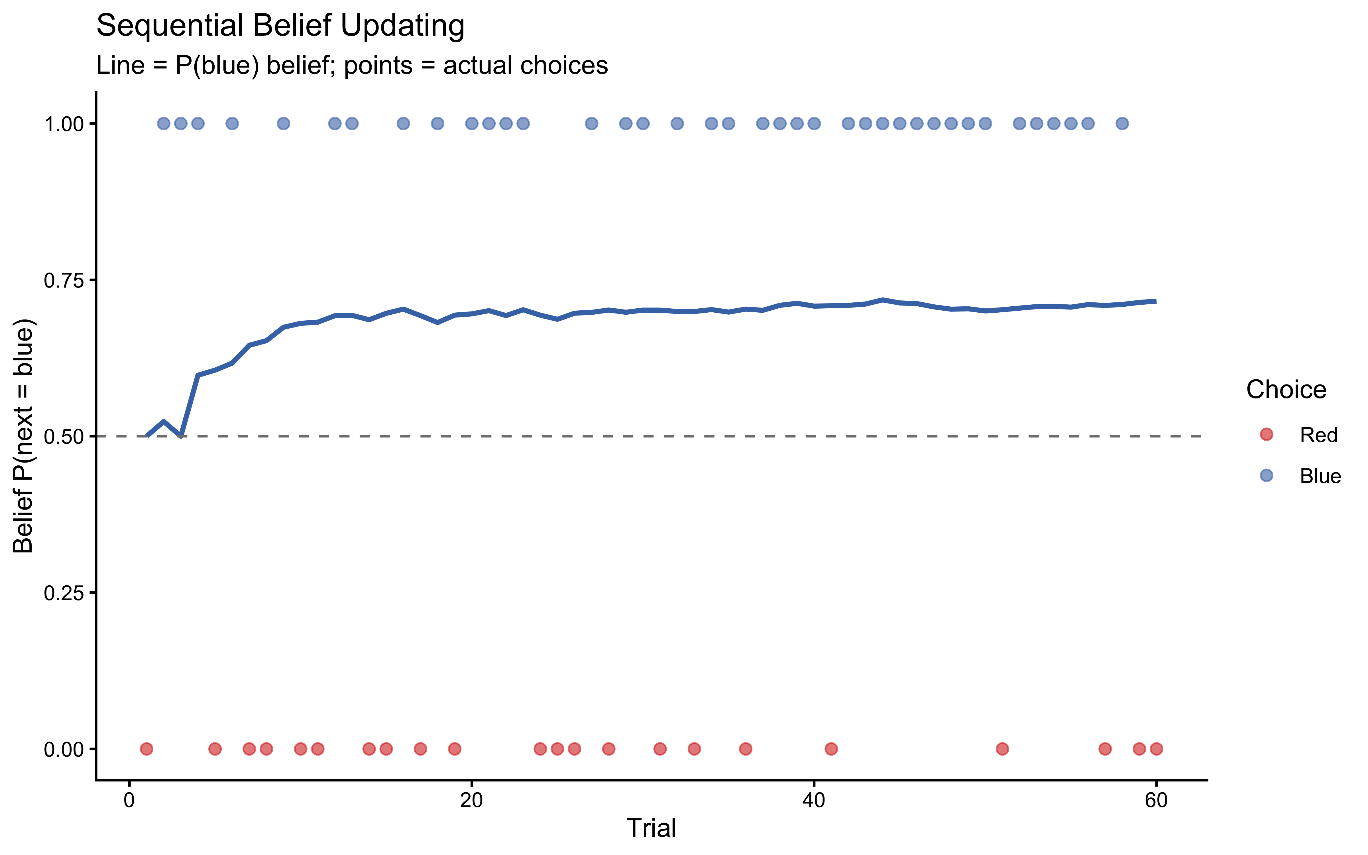 📍 Where we are in the Bayesian modeling workflow: Chs. 1–8 used the Bayesian statistical framework as a tool to model cognitive processes in the matching-pennies task. This chapter introduces a distinct scientific claim: the Bayesian cognition hypothesis — the proposal that the mind itself operates according to Bayes’ theorem. We use our Bayesian statistical tools to test whether this hypothesis fits human behaviour in a social learning task, applying the full validation battery from Chs. 5–7. The chapter also introduces Leave-Future-Out cross-validation for sequential models, a technique flagged in Ch. 7 but not developed there.