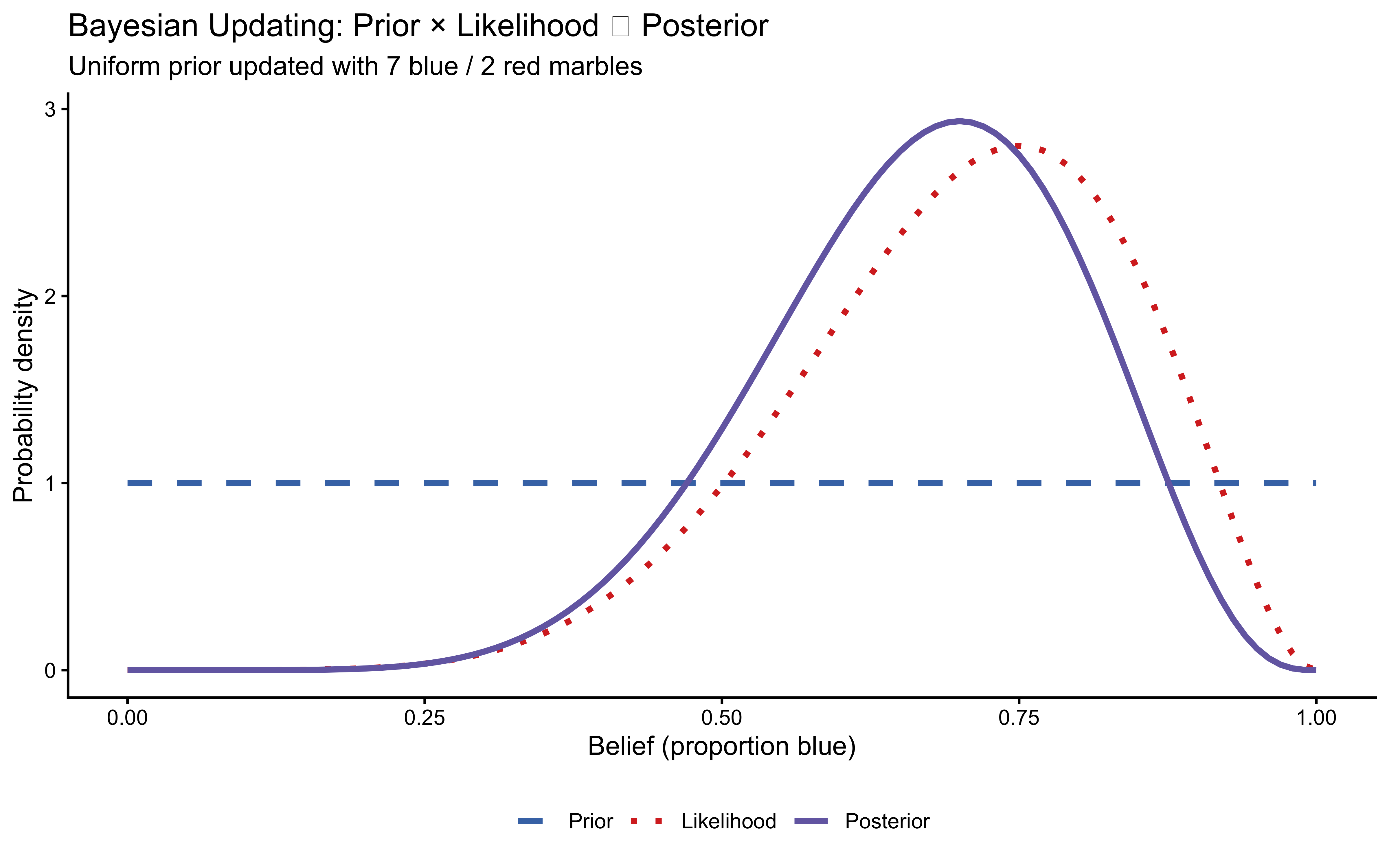 title = "Bayesian Updating: Prior × Likelihood ∝ Posterior",