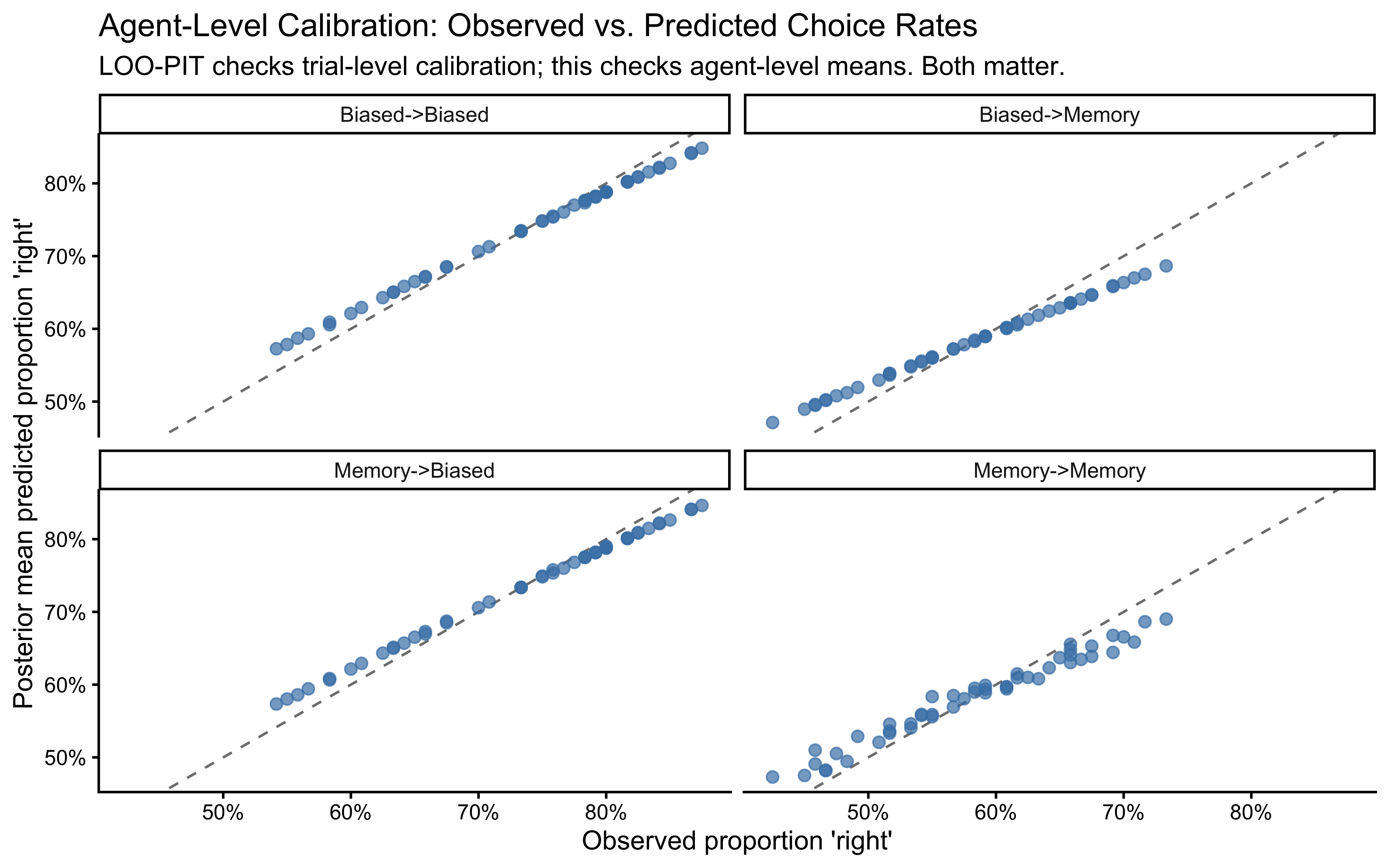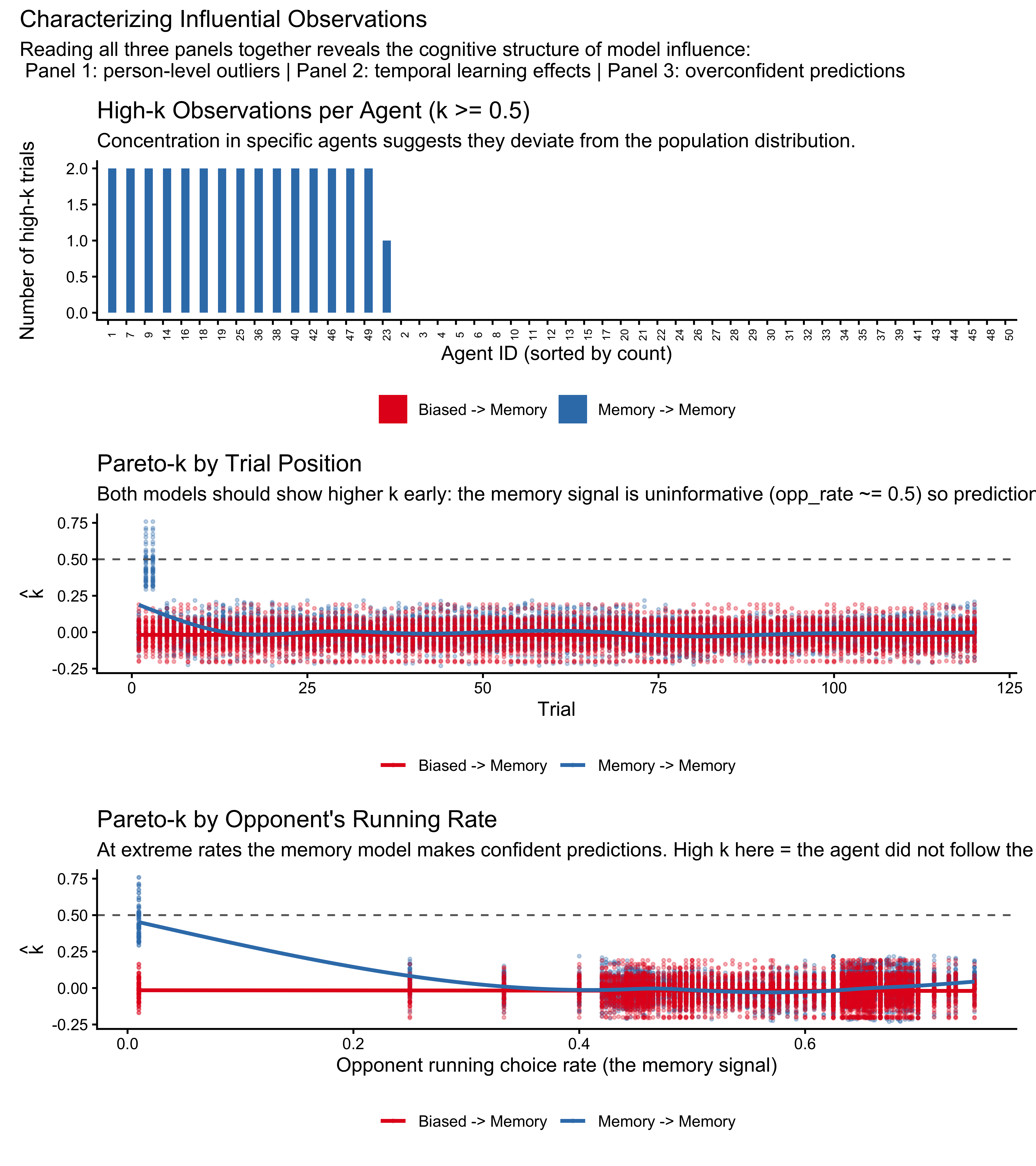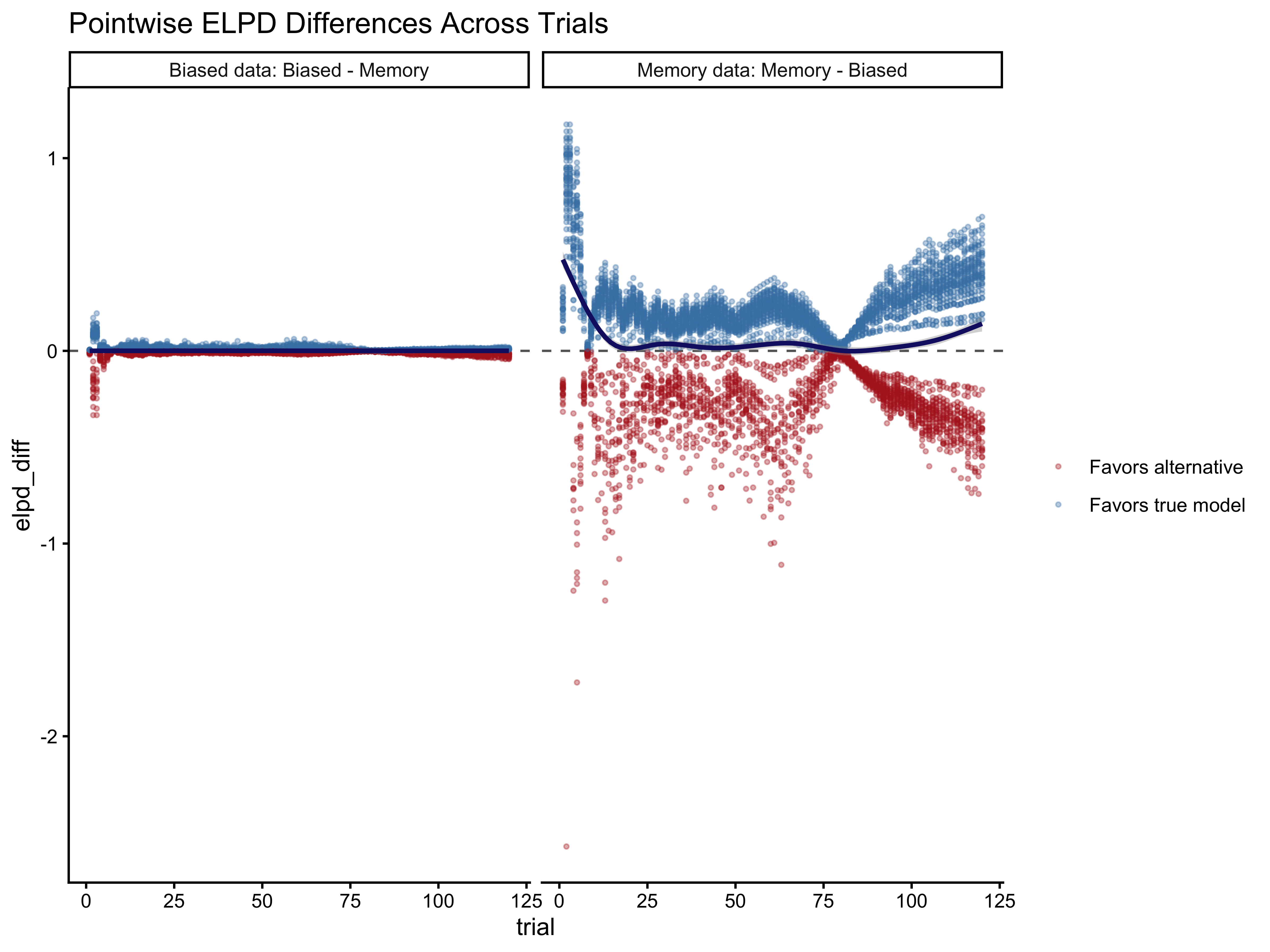For the biased agent model this is entirely correct: each trial is independent given the agent’s parameters. For our memory model as implemented, it is also technically valid: the memory signal opp_rate_prev is a pre-computed covariate that we pass into Stan as fixed data. Leaving out trial \(i\) from the LOO computation does not change opp_rate_prev for any other trial — the memory features were already computed before Stan ever ran.