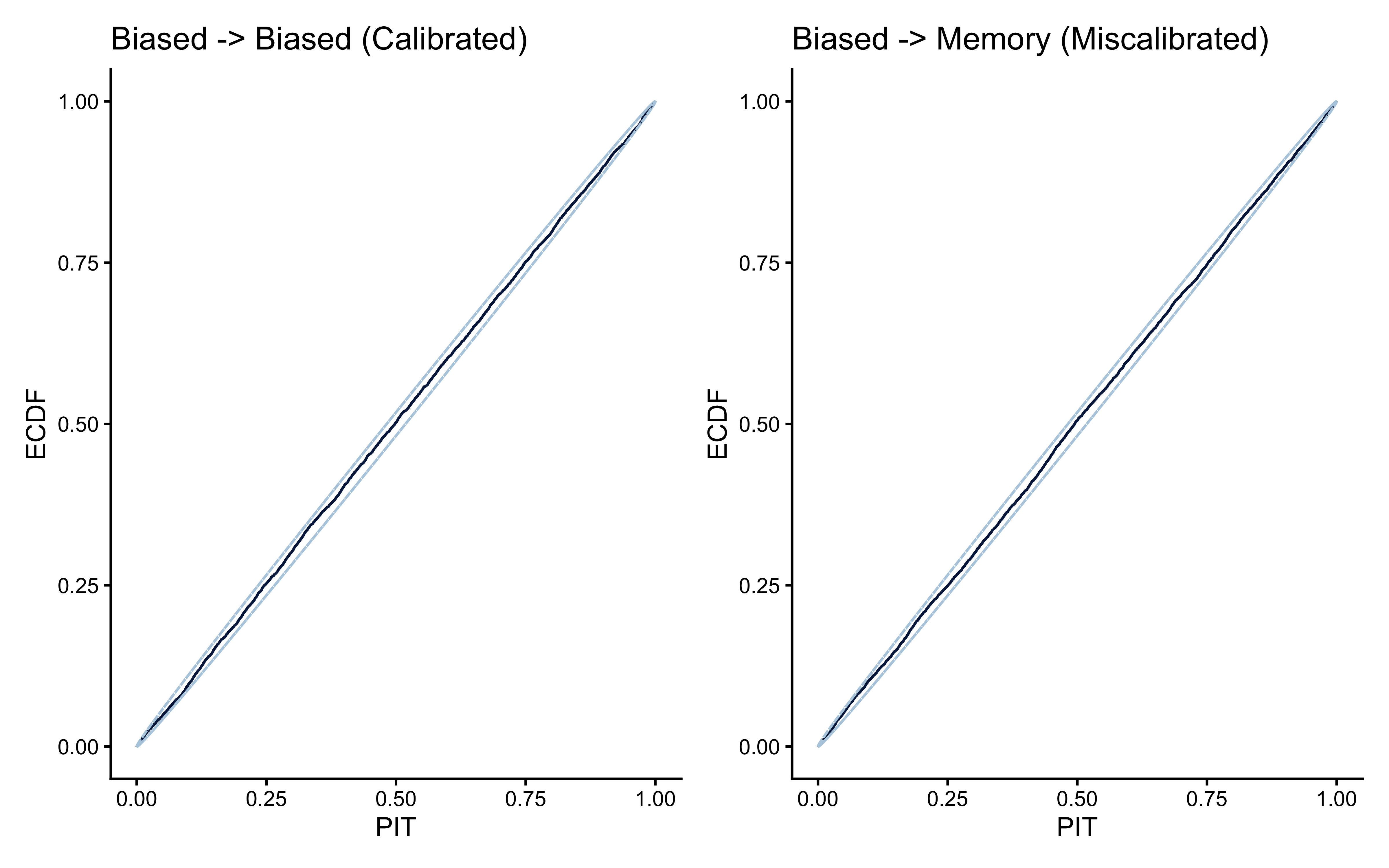 Vertical Variance (Binomial Uncertainty) Not all bins are created equal. Suppose our model assigns a stacking weight of \(0.50\). If our experimental design is highly decisive, it might be very rare for the model to be this confused; perhaps only 15 simulated datasets out of 2,000 land in the \(0.50\) bin. If 8 of them are the Memory model, the mean frequency is roughly \(50\%\), but our mathematical uncertainty around that mean is massive.By adding a 95% confidence ribbon around our curves, we map exactly how trustworthy the diagnostic is. Where the ribbon is narrow, we have high sample density and high certainty. Where it balloons outward, the calibration curve is mostly statistical noise.