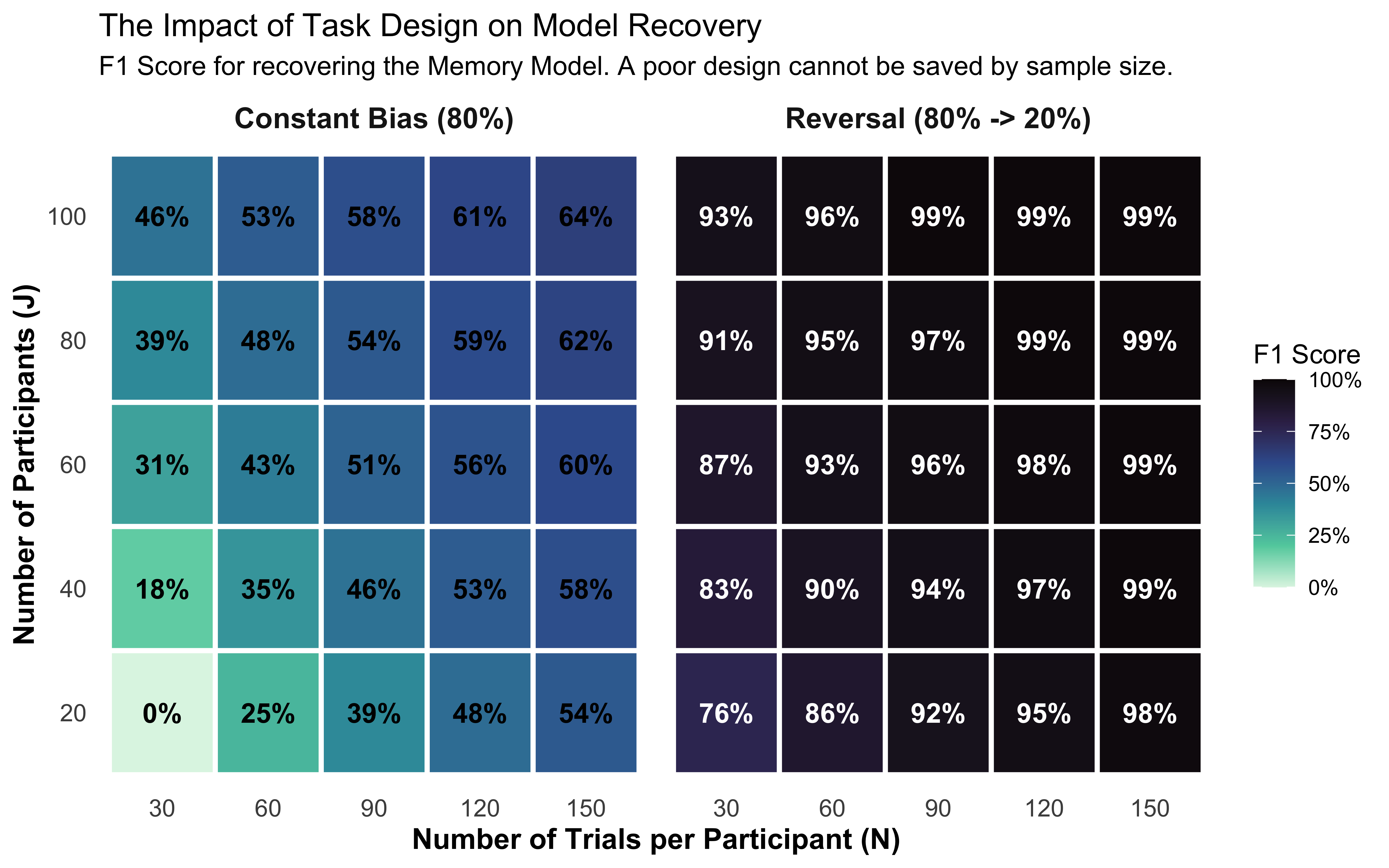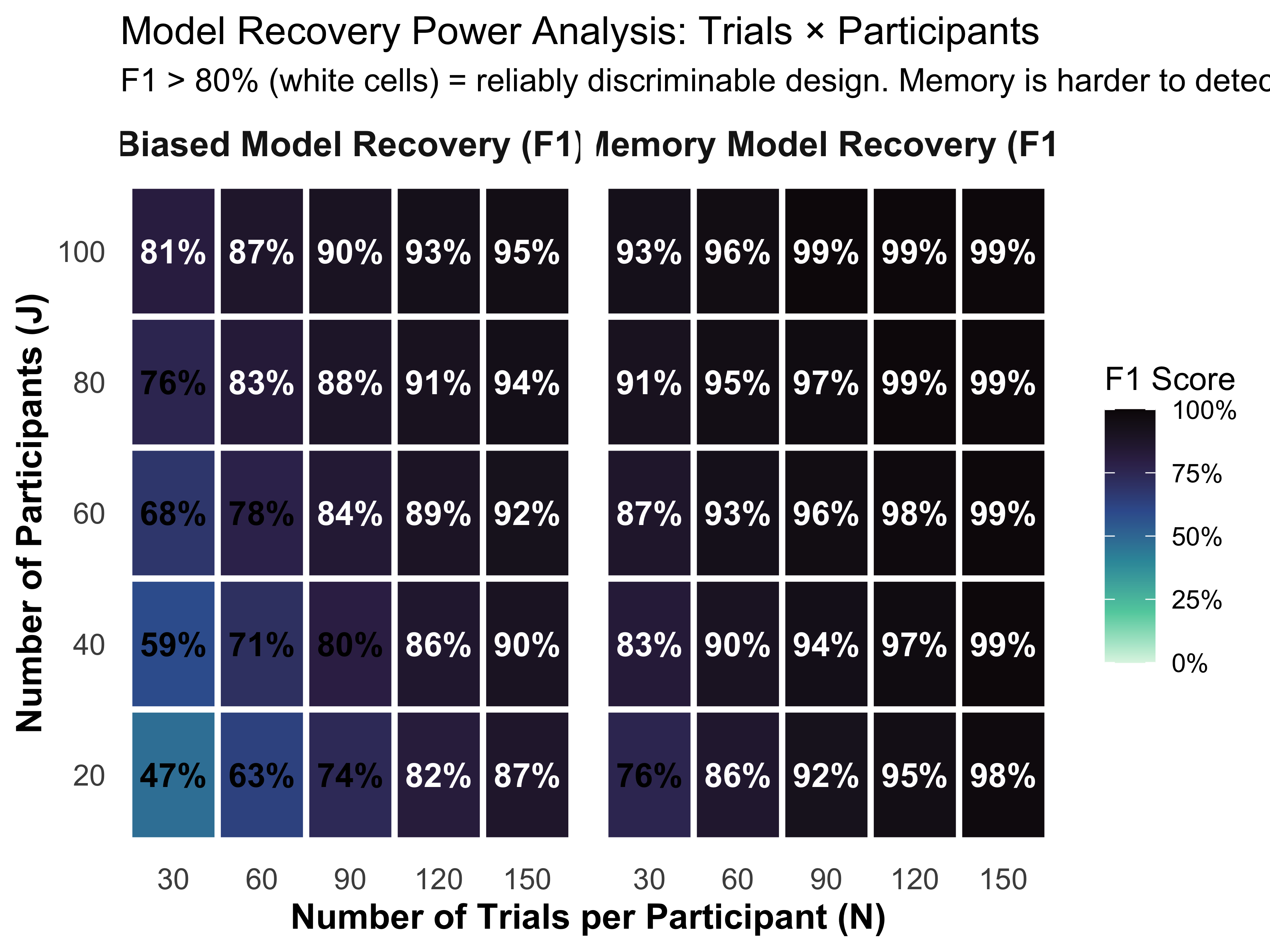 Conduct Power Analysis for Model Recovery: Use 2x2 confusion matrices and 2D trade-off plots (Trials vs. Participants) to determine if an experimental design is discriminative enough to identify the true cognitive mechanism.