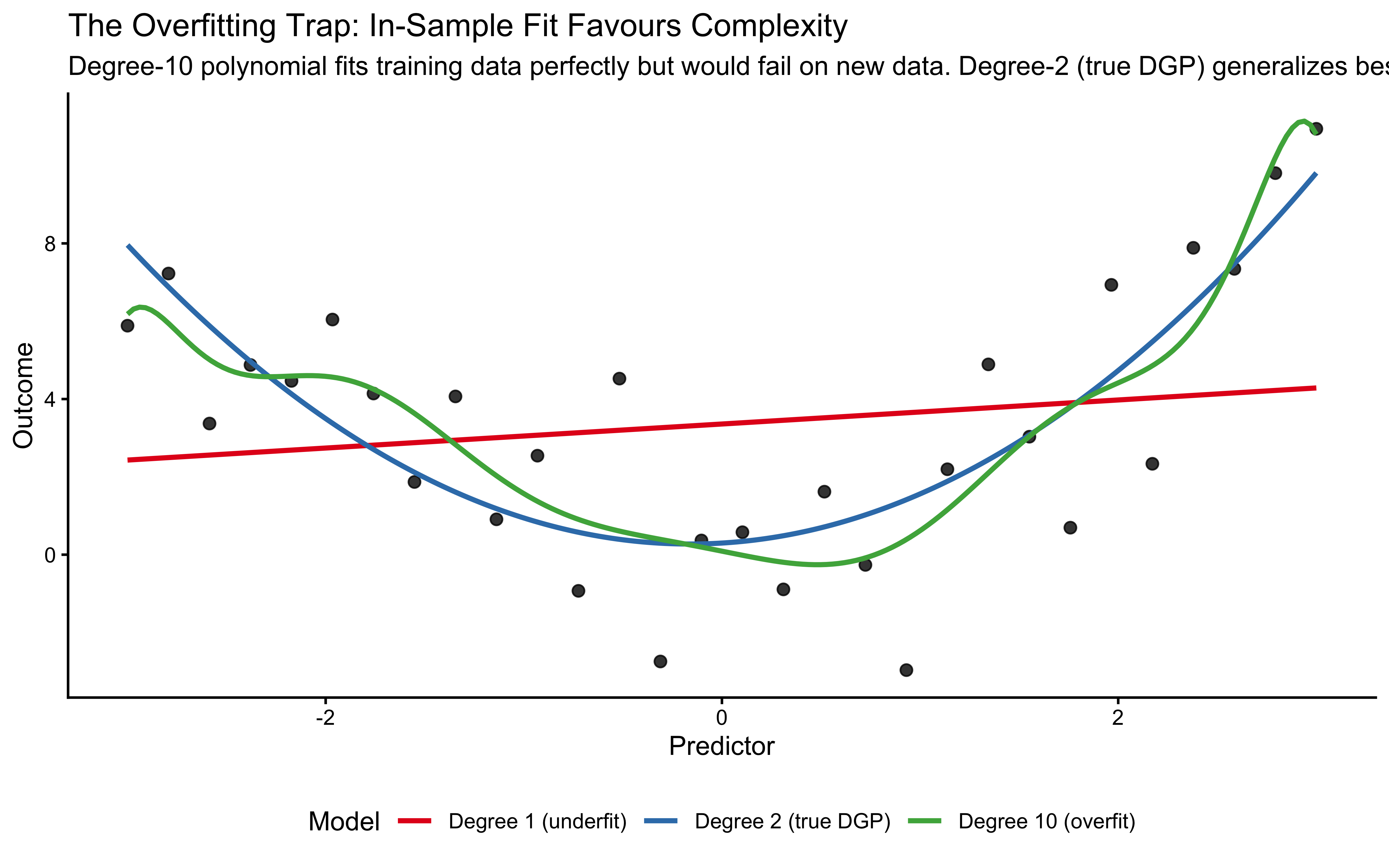 subtitle = "Degree-10 polynomial fits training data perfectly but would fail on new data. Degree-2 (true DGP) generalizes best.",