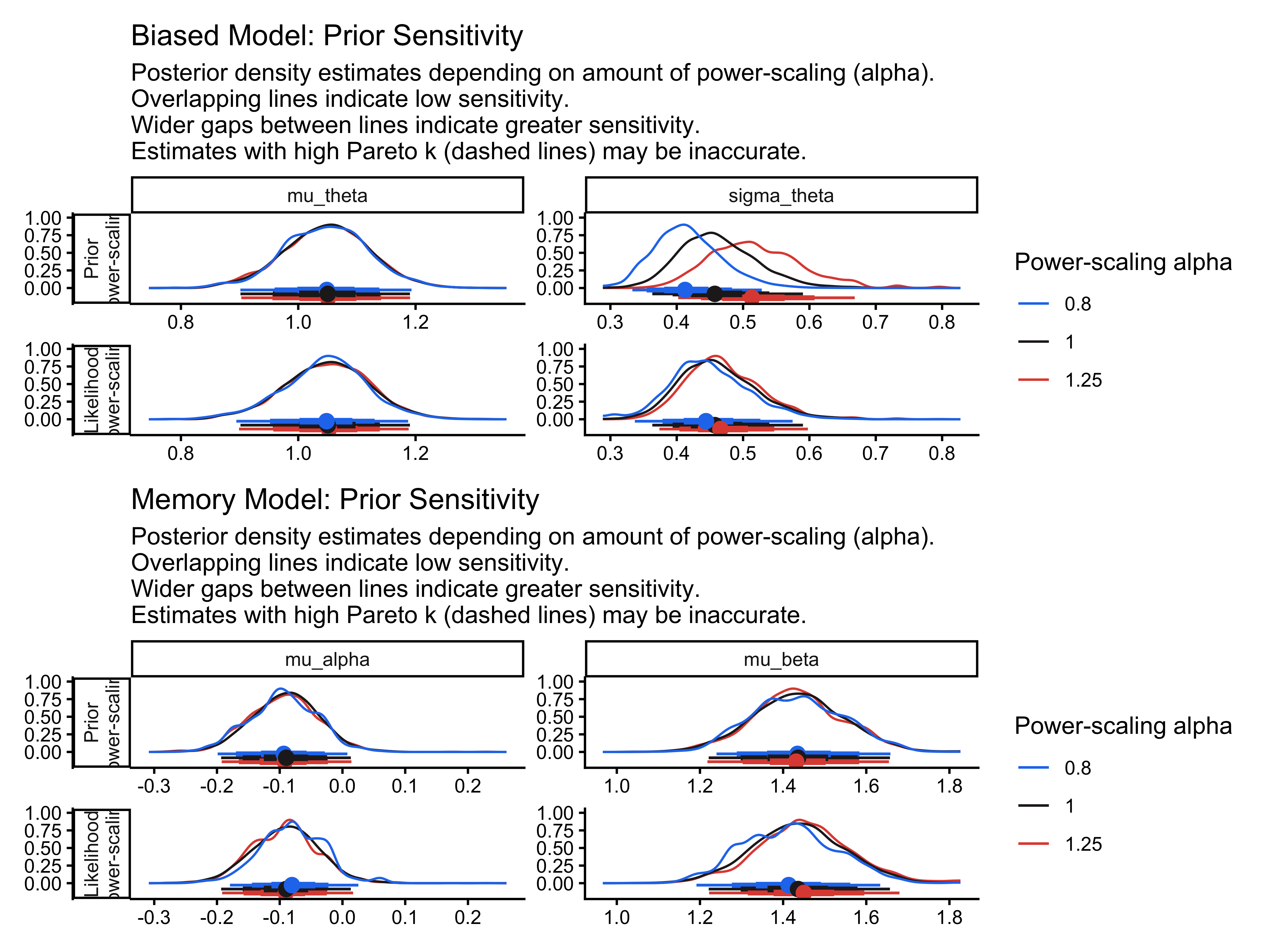 The console output above directly tests this: the priorsense tables include a diagnostic column that warns you if the LOO/ELPD computation is highly sensitive to the prior. Meanwhile, the density perturbation plots show why that sensitivity might be happening by revealing how the posterior on each parameter shifts as we increase or decrease the prior weight. If the biased model’s ELPD is flagged as sensitive but the memory model’s is not, then our model preference is partly an artifact of our prior choice rather than genuine predictive superiority.