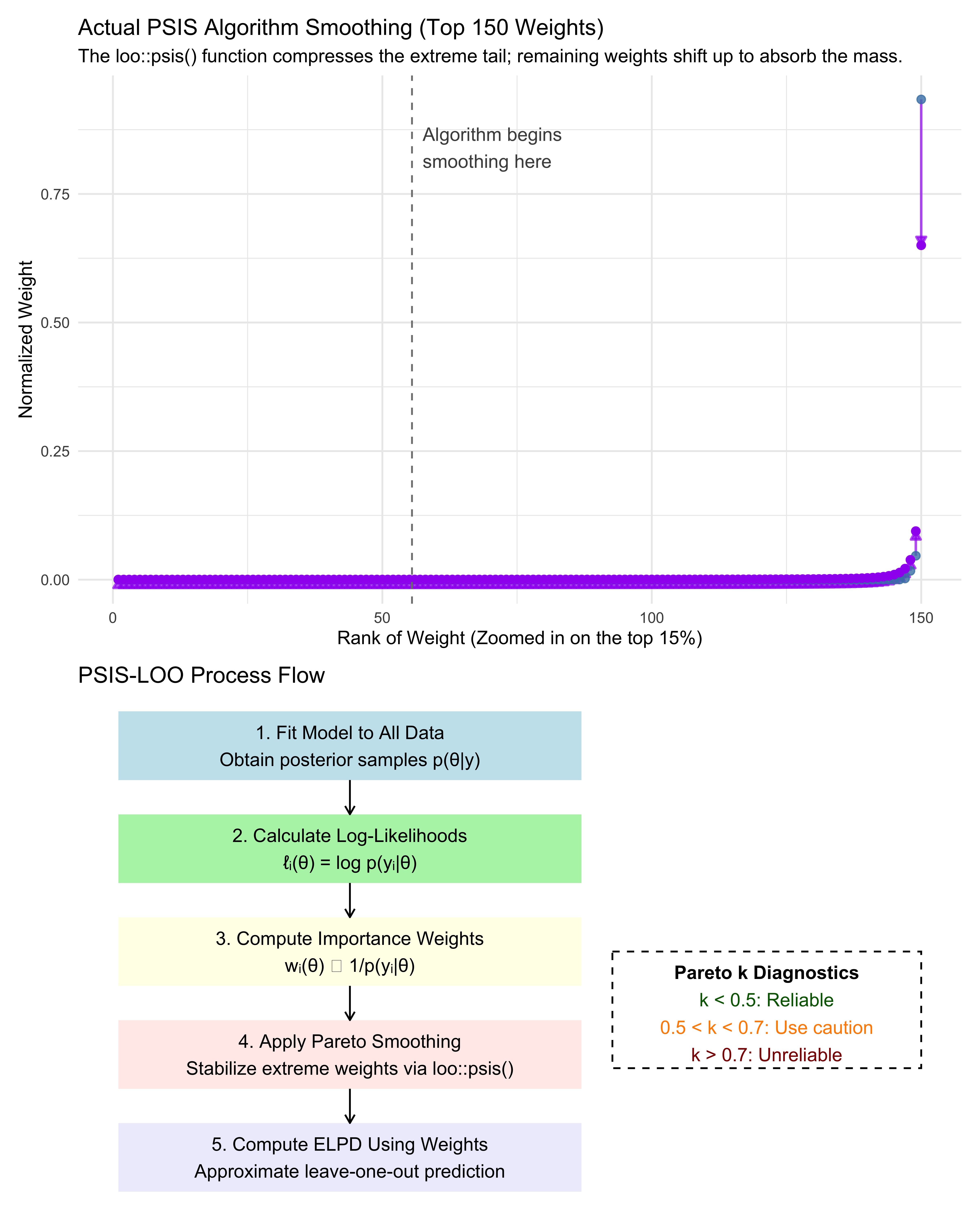Implement PSIS-LOO: Compute ELPD estimates from Stan fits and use Pareto-\(\hat{k}\) to identify when the importance-sampling approximation is unreliable.