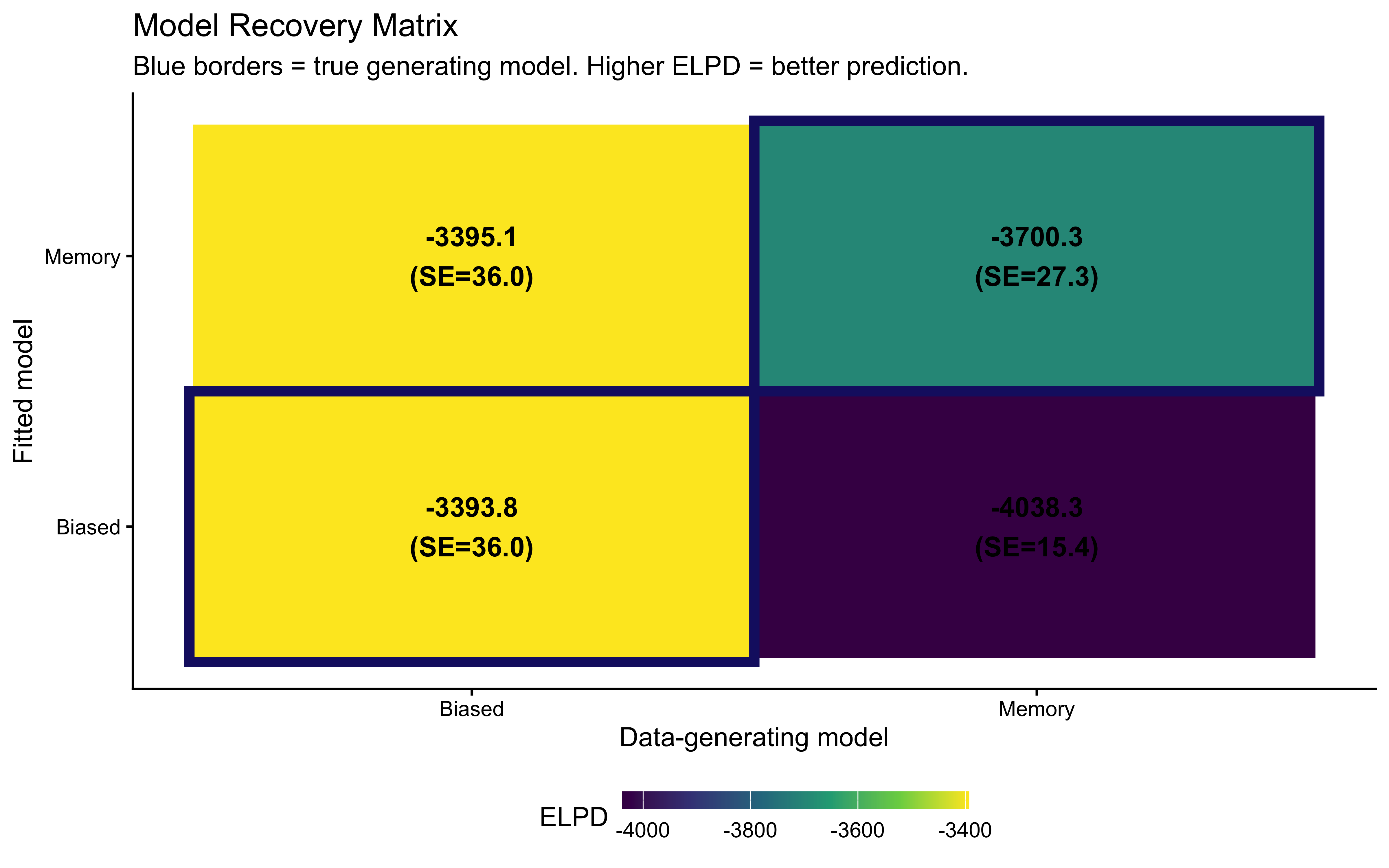 A better predictive score does not mean a better mechanistic explanation. Two models can achieve identical ELPD while making diametrically opposite claims about the cognitive mechanism generating the data. If the biased model and the memory model achieve similar predictive performance, that does not mean the two theories are equivalent — it means the data at hand cannot distinguish them. The correct scientific response is to design experiments targeting the mechanistic difference: conditions where the two models predict qualitatively different behavior.