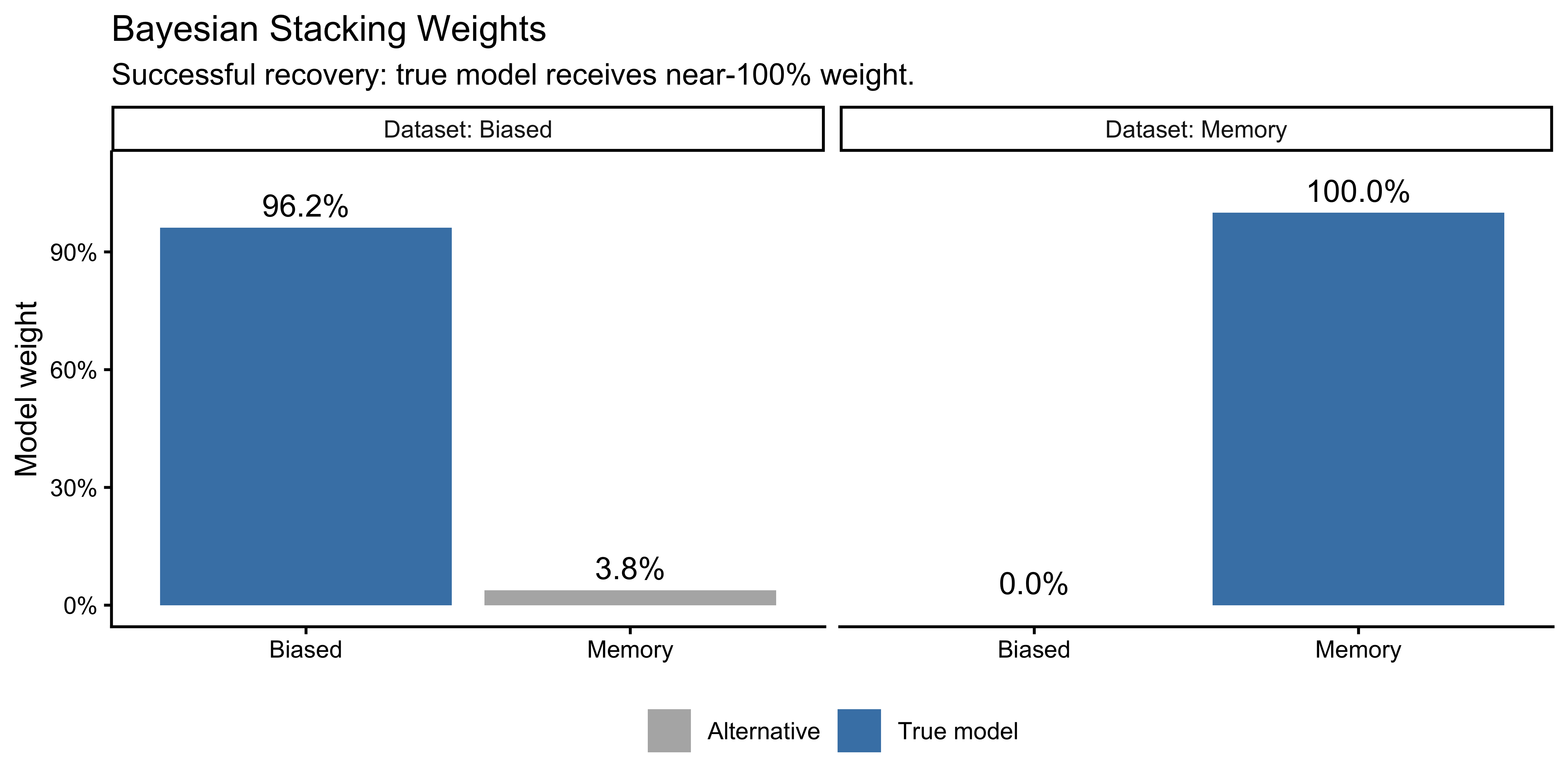 As in previous chapters, we heavily rely on simulations to understand these techniques and validate our model comparison procedure. Because we control the data-generating mechanism, we can evaluate not just whether model comparison produces a preference, but whether it produces the correct preference — the model recovery test.