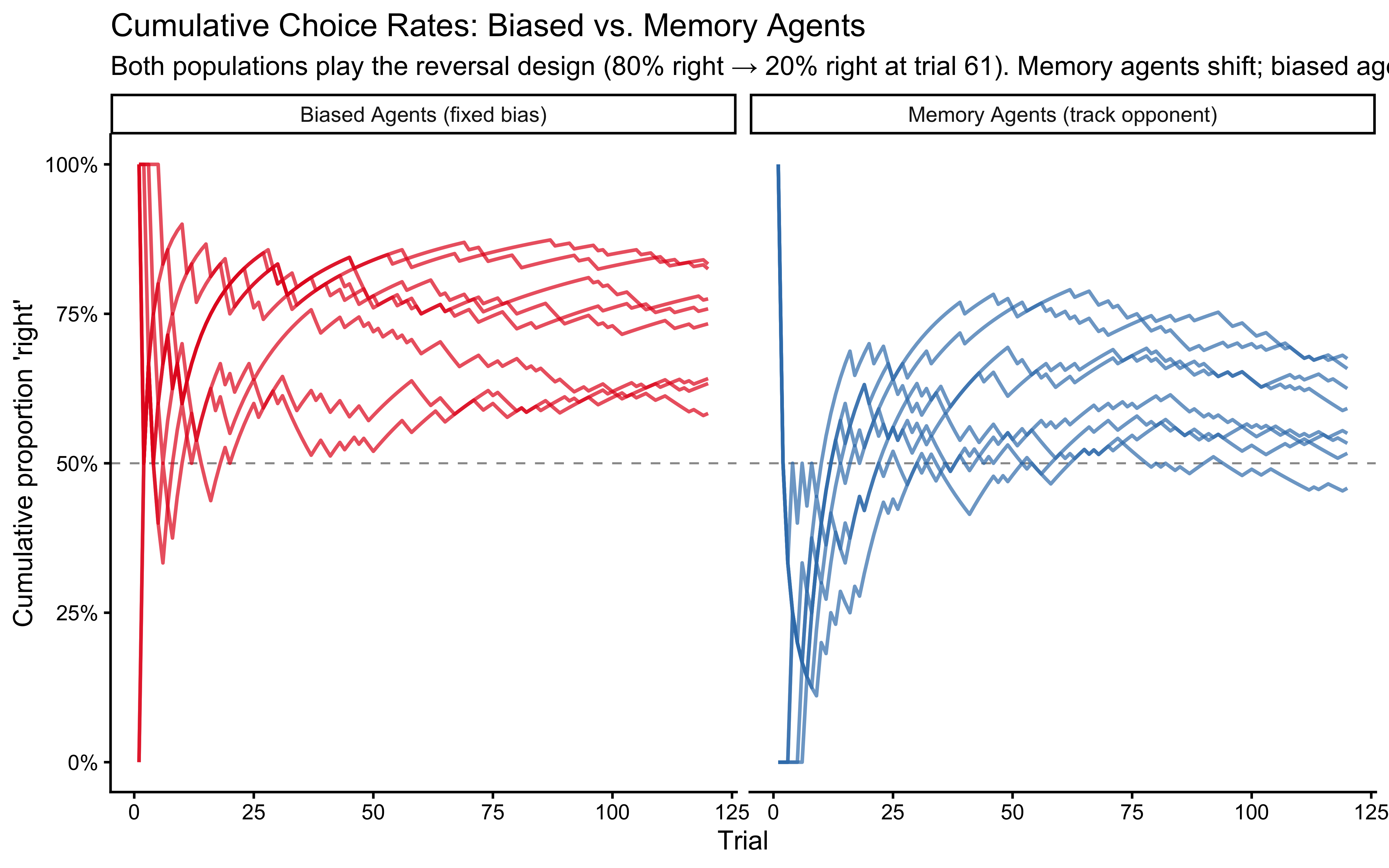 Two design lessons cut across all of these tools: - The reversal design (validated in Ch. 5, extended in Ch. 6) was essential — a constant-bias opponent makes the biased and memory models statistically inseparable, and no amount of data fixes a confounded design. - All models must pass their individual quality checks before comparison. Comparing a well-fitted model against one with divergences is not a fair scientific test.
