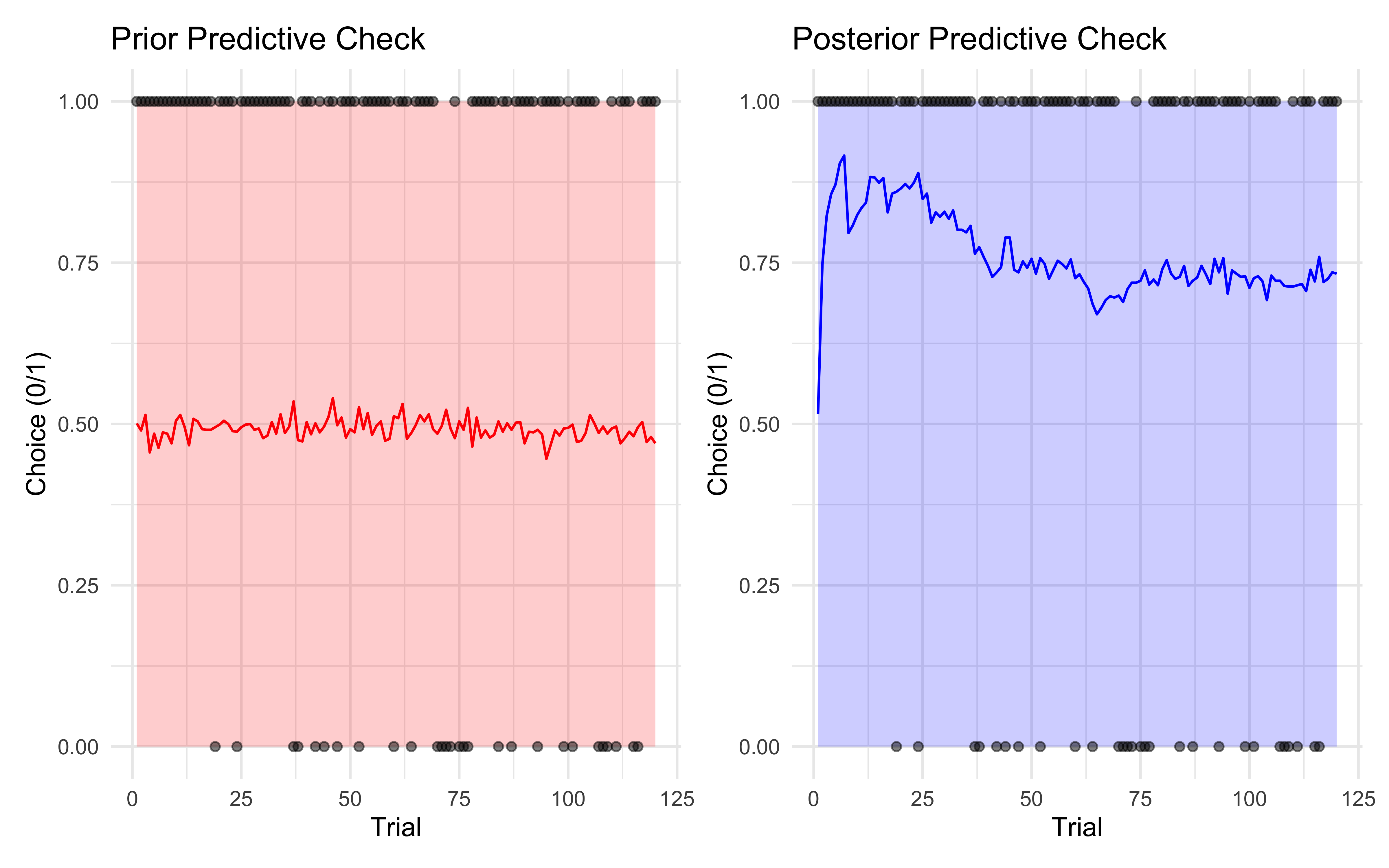 * Fit models using cmdstanr to obtain posterior distributions for parameters like choice bias (theta).