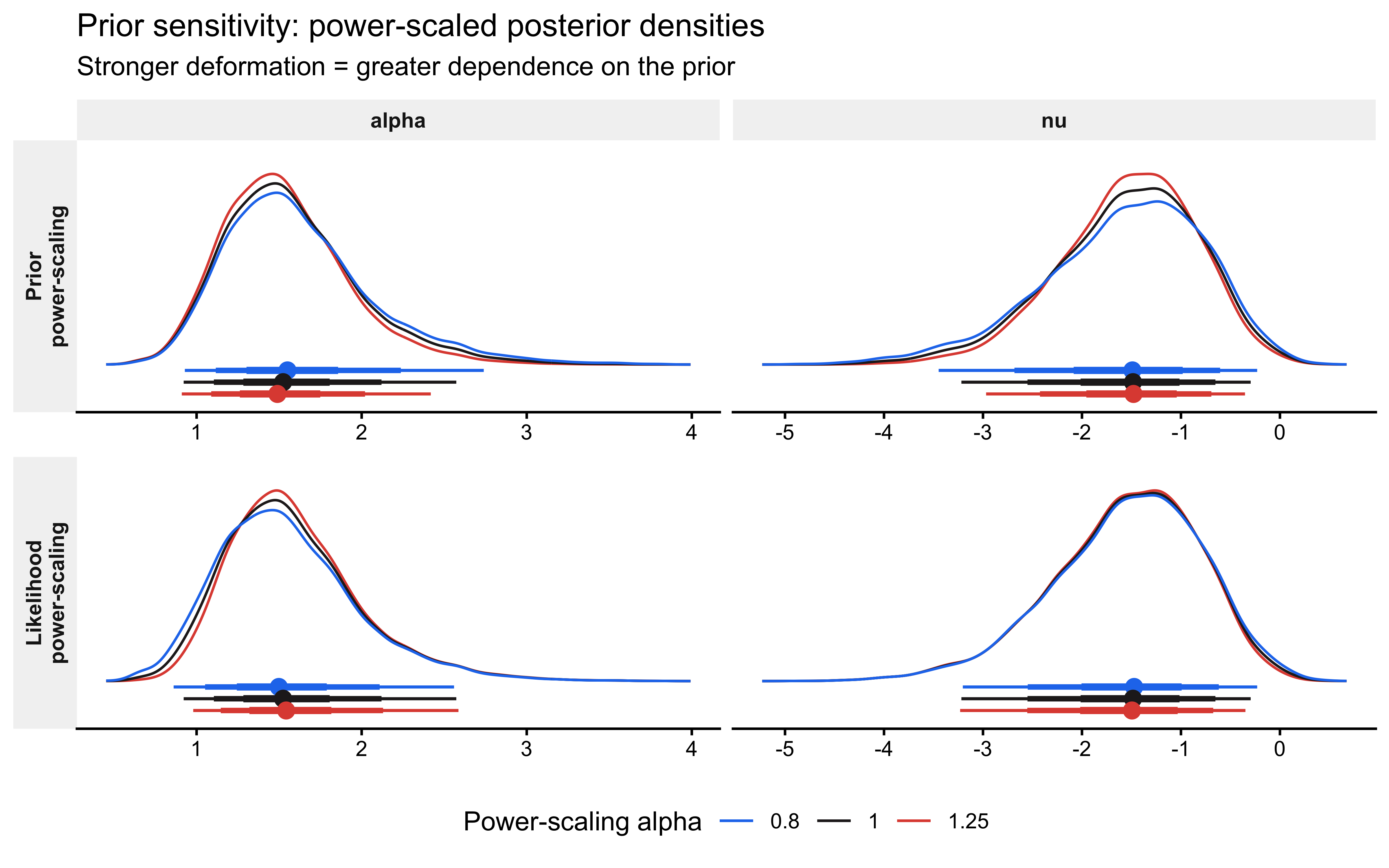 Prior sensitivity quantifies what identifiability analysis predicts. Section 6 showed analytically that \(\pi\) is not identified from binary i.i.d. data. Section 7’s priorsense analysis made this empirical: a high \(\hat{\psi}\) for the noise logit \(\nu\) and a low \(\hat{\psi}\) for the bias logit \(\alpha\) is the expected fingerprint. Reporting both analyses together — the manifold plot and the power-scaling sensitivities — gives the reader a complete picture of what the data do and do not constrain.