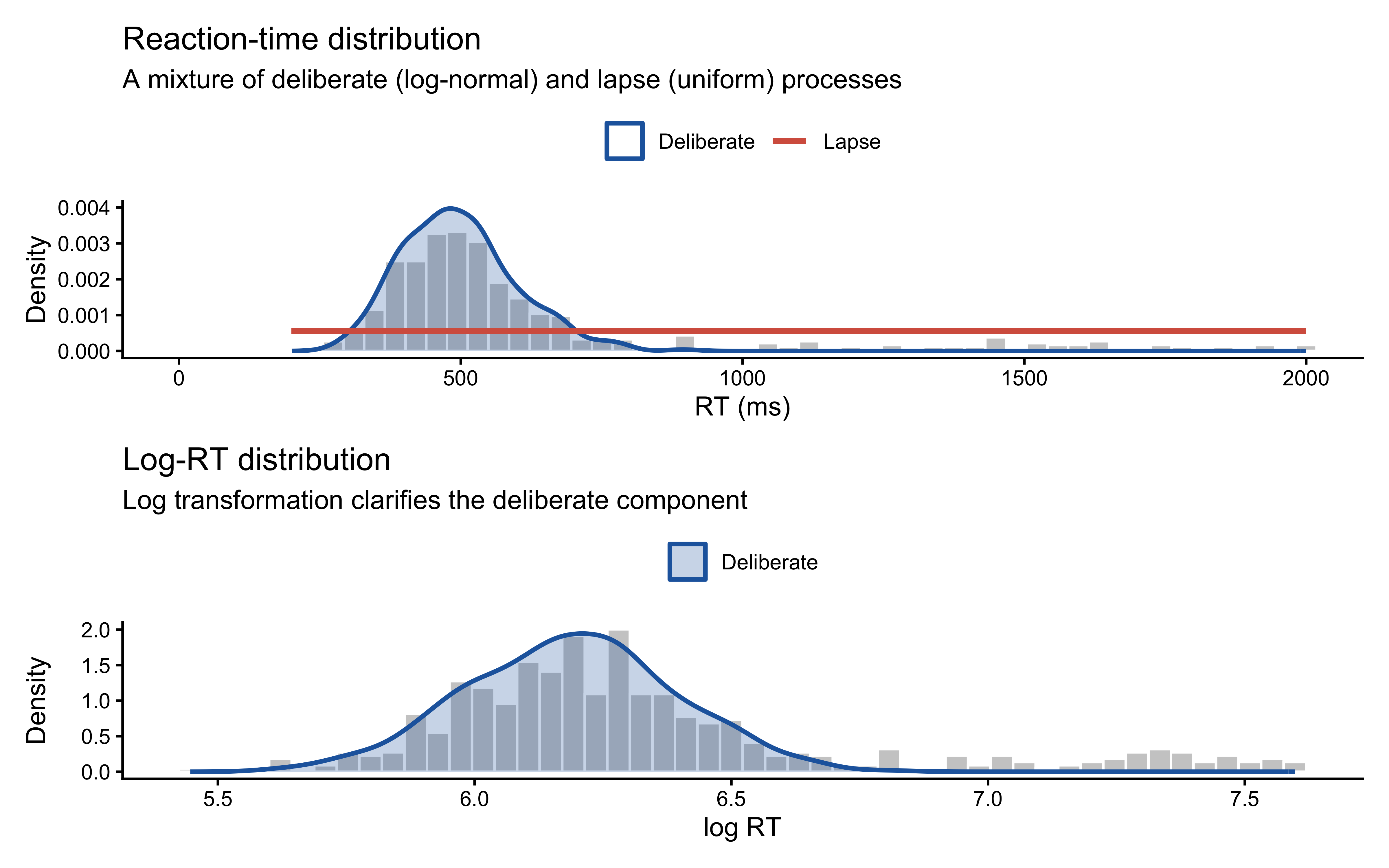 subtitle = "A mixture of deliberate (log-normal) and lapse (uniform) processes",