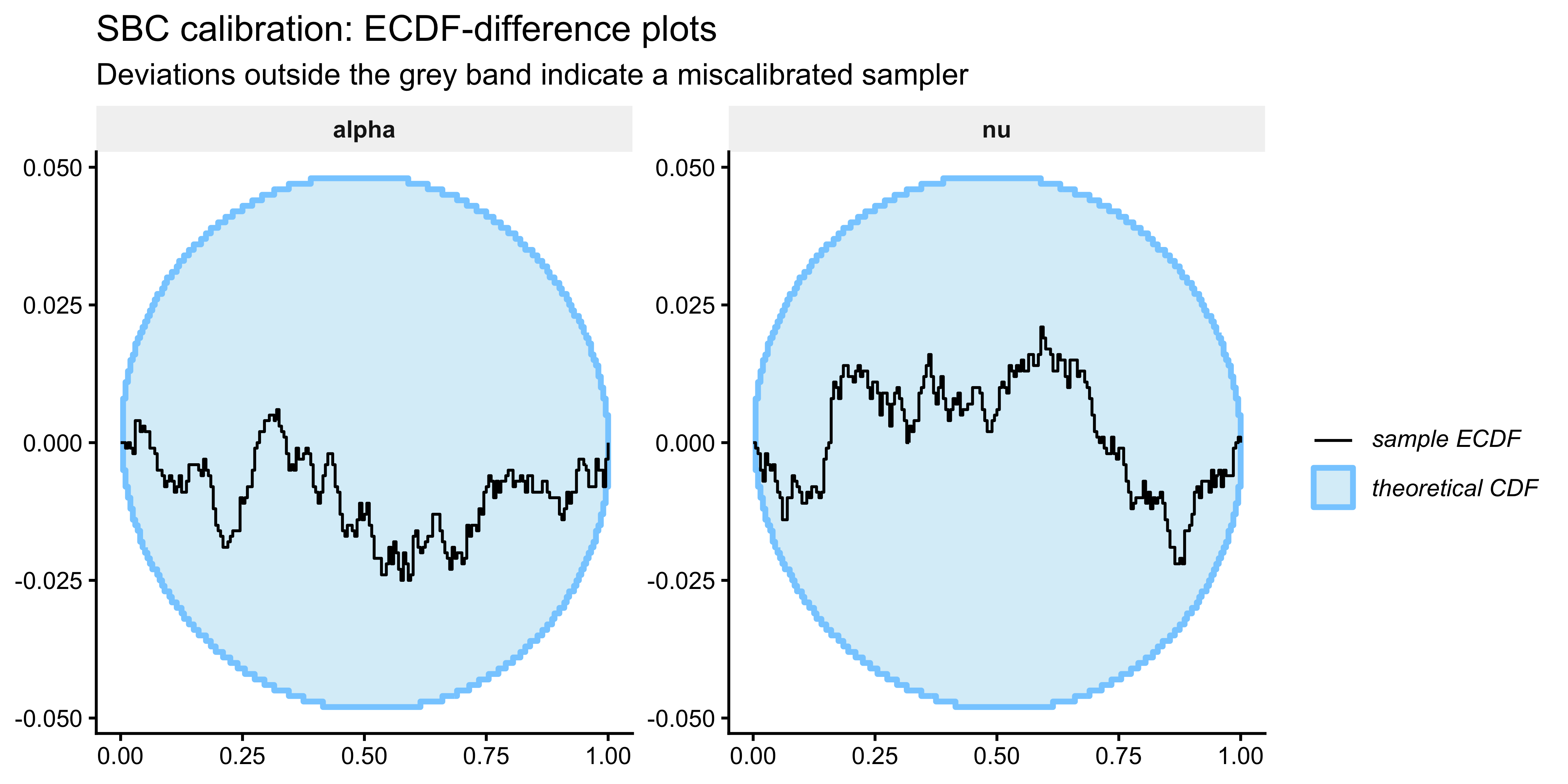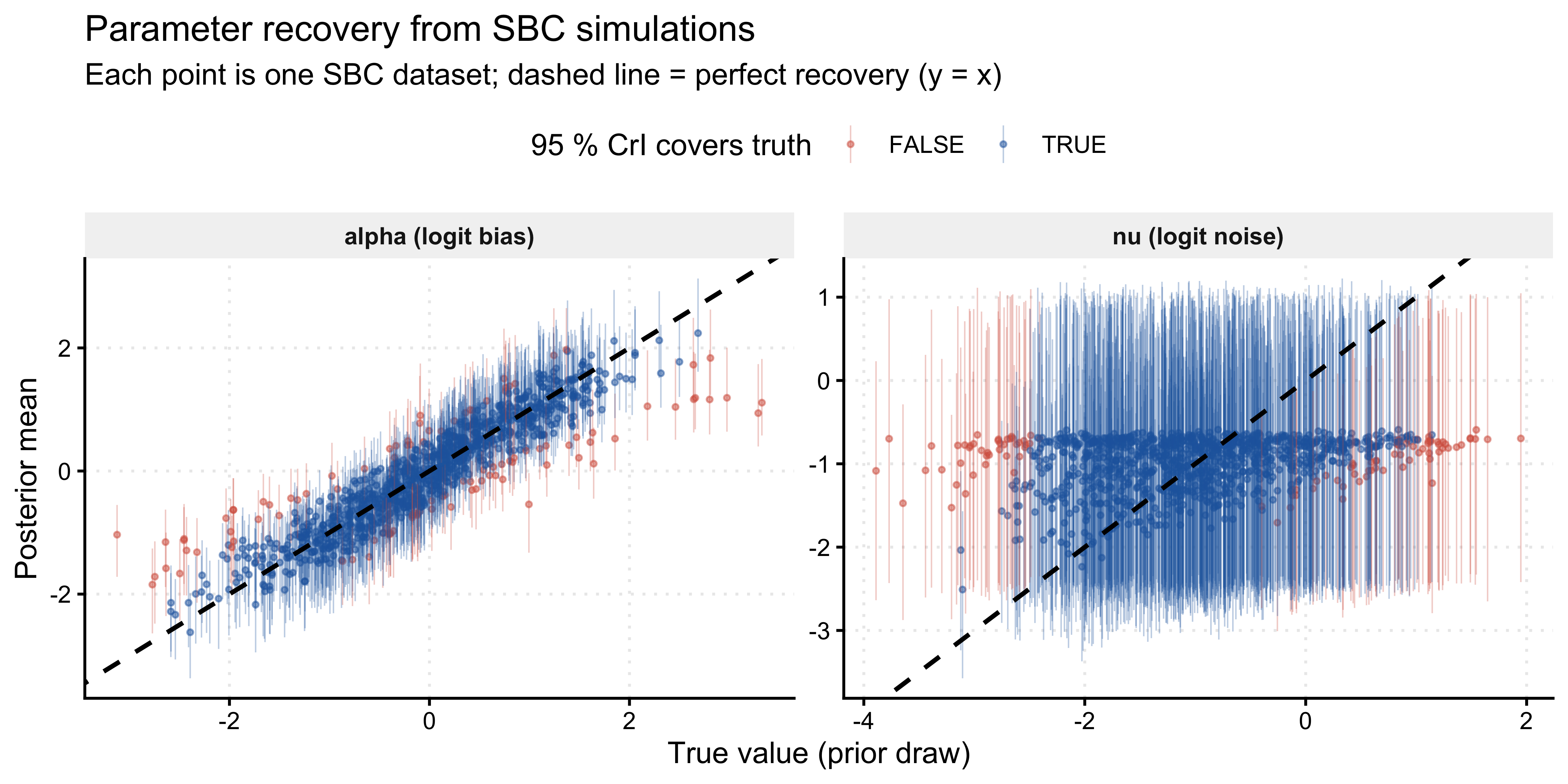 Debugging note. If you see divergences in the multilevel mixture model, the most common cause is the noise SD \(\tau_\nu\) approaching zero, which creates a funnel geometry in the NCP. Tighten the half-normal prior on \(\tau_\nu\) (e.g., from \(\text{Half-Normal}(0, 0.3)\) to \(\text{Half-Normal}(0, 0.2)\)) and check whether the SBC ECDF-difference for \(\nu\) shows a U-shape (overconfidence). Do not respond by increasing
