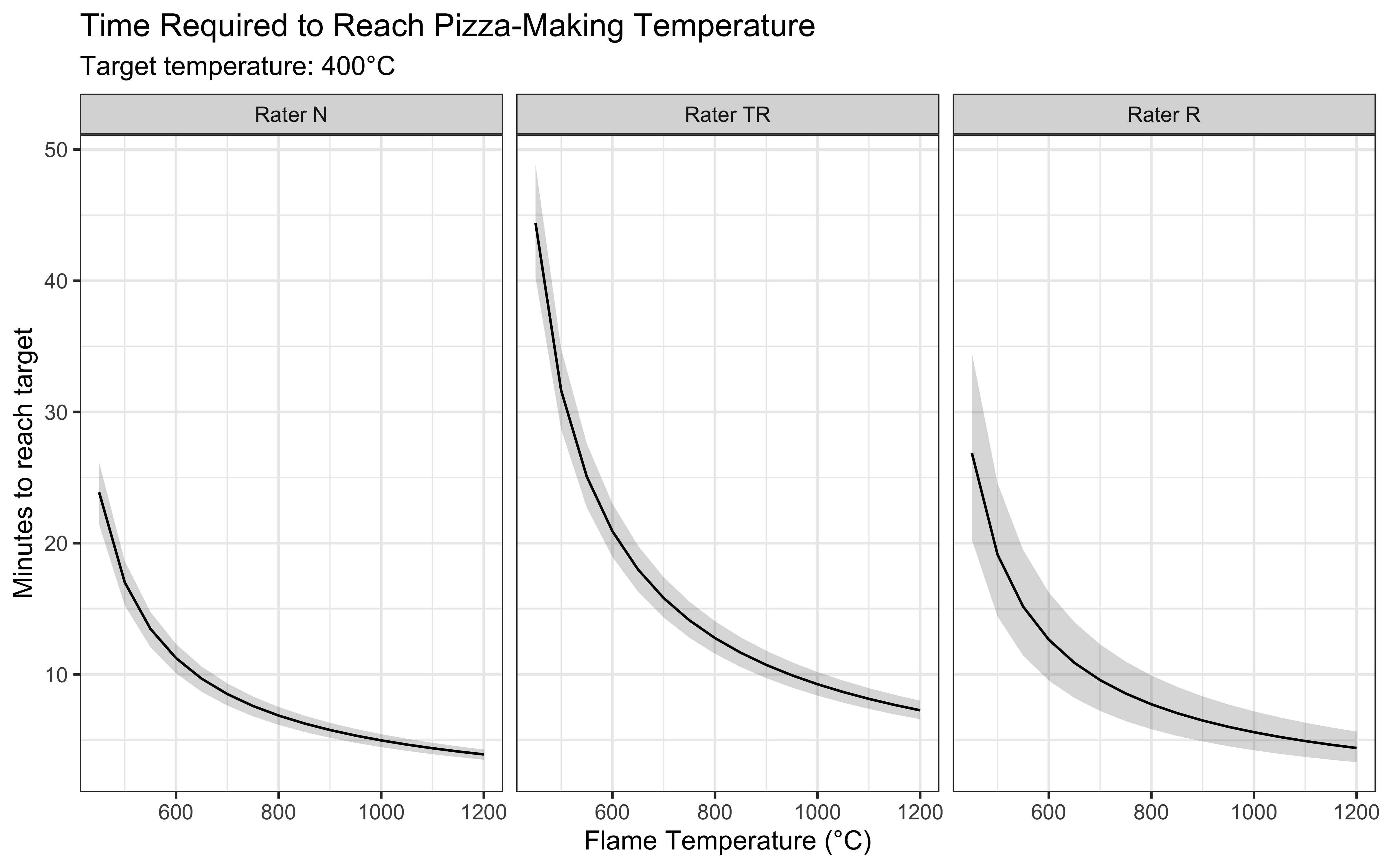 Our analysis reveals several important insights for practical pizza making. First, the heating time decreases non-linearly with flame temperature, showing diminishing returns at very high temperatures. We also observed differences between raters in their measured heating times. These variations likely stem from differences in measurement technique and location on the stone, highlighting the importance of consistent temperature monitoring practices. E.g. N measure the temperature at the boundary between flame and stone, which matches the model’s assumptions better than R, who measures at the center of the stone.