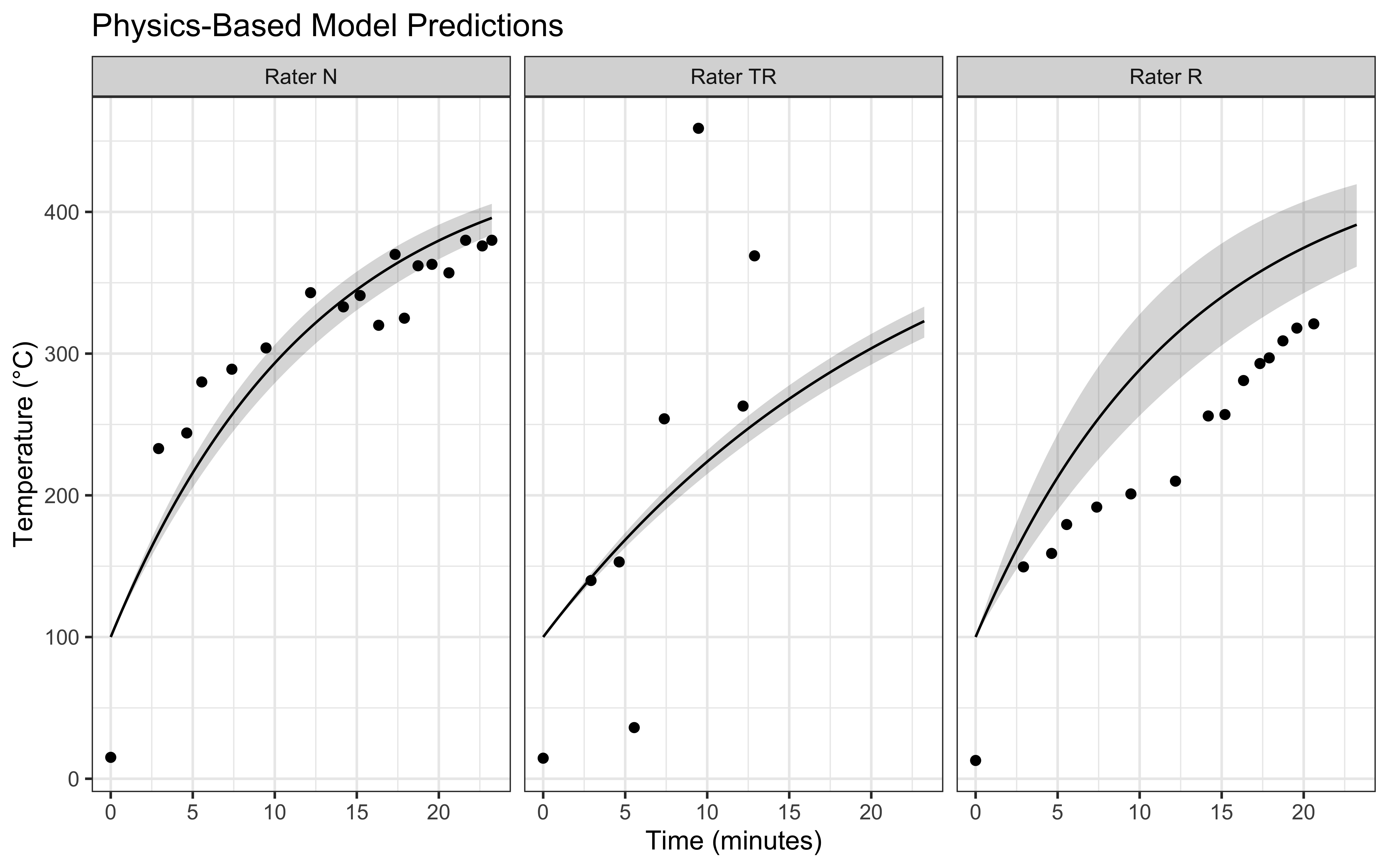 The Stan implementation translates our mathematical model into a computational framework. We assign informative priors to our parameters based on physical understanding: the heating coefficient (HOT) is expected to be small but positive, while measurement error (sigma) follows an exponential distribution to ensure positivity while allowing for varying levels of uncertainty between raters. To visualize our model’s predictions and assess its performance, we extract posterior samples and generate predictions across our time range: